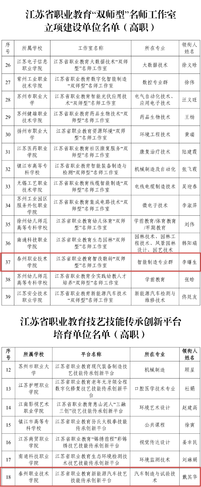 近日,江苏省教育厅公布首批江苏省职业教育“双师型”名师工作室和技艺技能传承创新平台建设单位名单。经教师自主申报、教育局(学校)择优推荐、省教育厅组织专家遴选和网上公示,确定首批江苏省职业教育“双师型”名师工作室立项建设单位100个(高职50个、中职50个),培育建设单位13个(高职);首批江苏省职业教育技艺技能传承创新平台立项建设单位50个(高职30个、中职20个),培育建设单位18个(高职)。其中,我院智能制造学院李曙生教授领衔的江苏省职业教育智改数转“双师型”名师工作室成功获批立项,智能制造学院戴其华高级技师领衔的江苏省职业教育新能源汽车技艺技能传承创新平台成功获批培育。