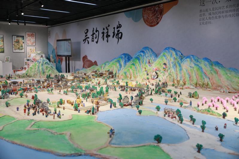 《吴韵祥瑞图》大型彩色泥塑作品由无锡职业技术学院数百名师生耗时近两年打造,本次是江苏省内巡展的第四站,也是第二次进入大学校园展出。该作品规模宏大、人物众多,实体场景长10米,宽6米,高2米,塑造与描绘了120个场景,共计300多个彩塑人物。该作品以惠山泥人“阿福”诞生地无锡惠山及其山下惠山古镇为背景,采用惠山泥人传统技艺,手捏泥塑了惠山、锡山、“天下第一山”牌坊、寄畅园、二泉书院、皇帝下江南等场景,生动展示了无锡名山名泉、历史风貌、时令节气,再现了水韵江南春耕、夏种、秋收、冬藏的诗与远方。