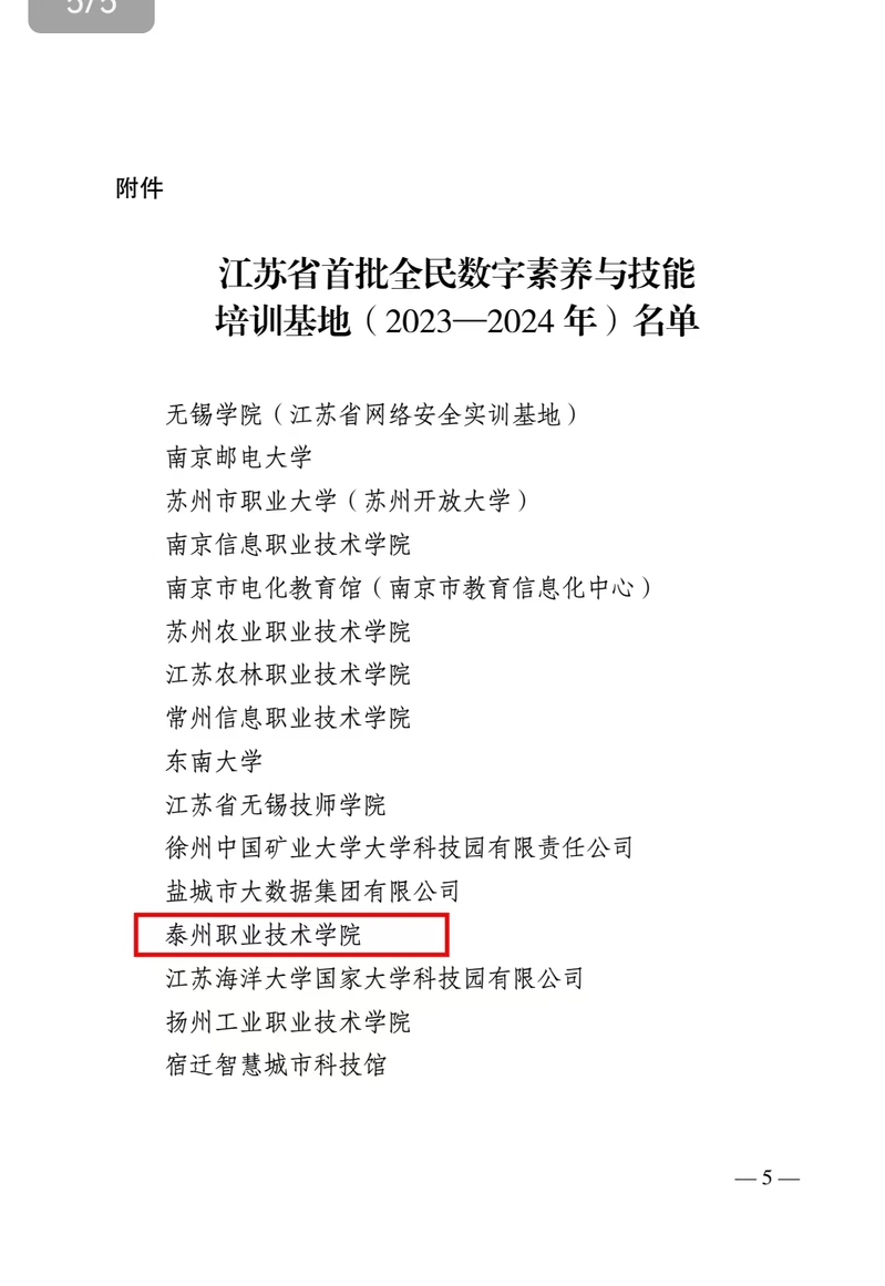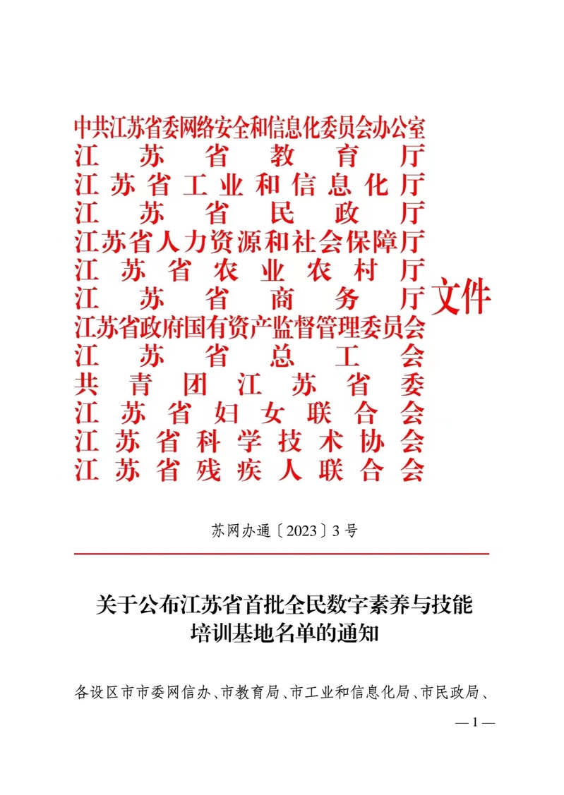 近日,江苏省委网信办、省教育厅、省人力资源社会保障厅等 13个部门联合发文公布江苏省全民数字素养与技能培训基地(2023—2024年)名单,我校成功入选,成为江苏省首批16家全民数字素养与技能培训基地之一。