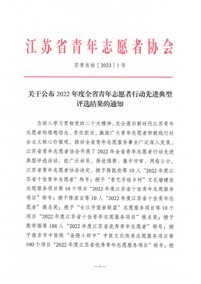 我校青年志愿者服务总队荣获“2022 年度江苏省青年志愿服务行动组织奖”