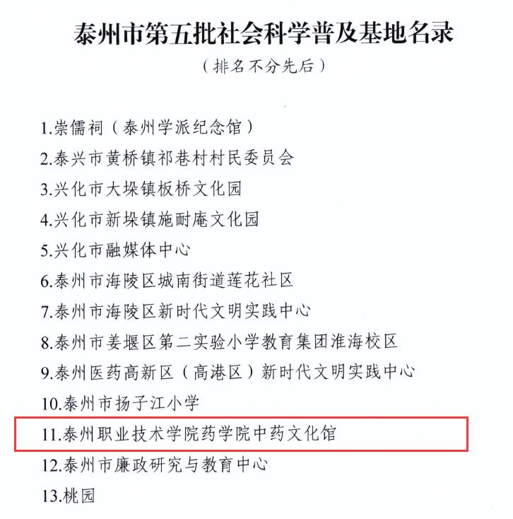 近日,泰州市哲学社会科学界联合会公布了第五批泰州市社会科学普及基地名单,我校药学院中药文化馆成功入选。
