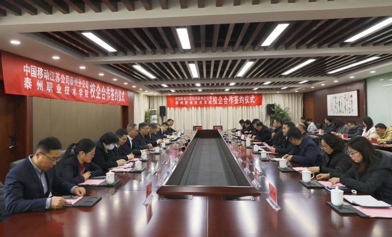 1月24日,泰州职业技术学院与中国移动通信集团江苏有限公司泰州分公司在学校行政楼216会议室成功举行校企合作签约仪式。校党委书记张涛,中国移动通信集团江苏有限公司泰州分公司总经理智勇,校党委副书记、校长吕林,中国移动通信集团江苏有限公司泰州分公司副总经理杭晓明,副总经理张磊,泰州铁通总经理狄中尚,校党委副书记钟文乐,校党委委员、副校长陈芷,校党委委员、副校长慕博华,宣传部部长朱杰出席签约仪式。签约仪式由校党委委员、副校长李曙生主持。