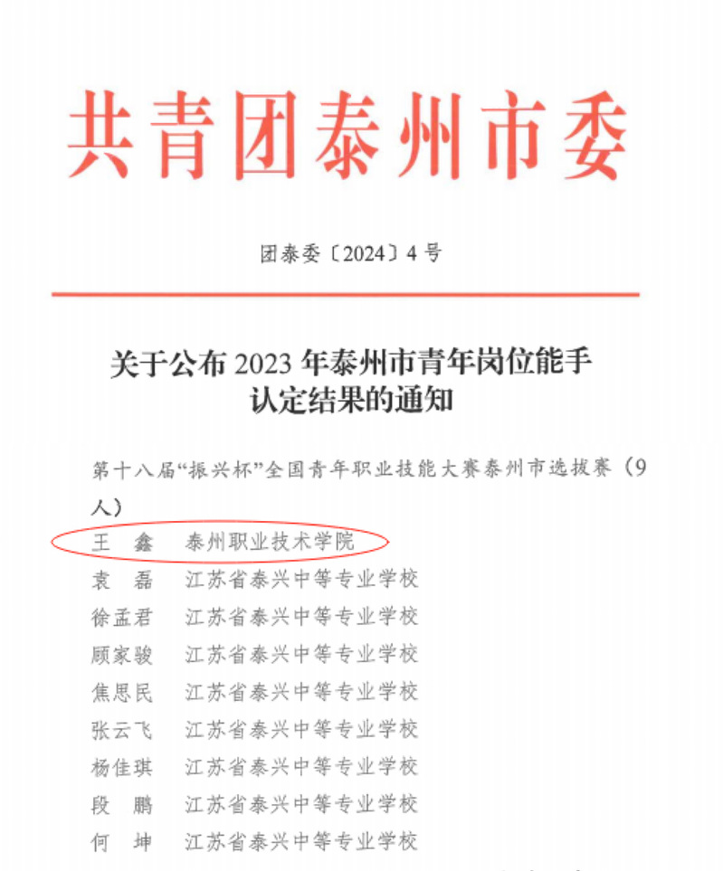 喜报:我校学子首获“泰州市青年岗位能手”称号