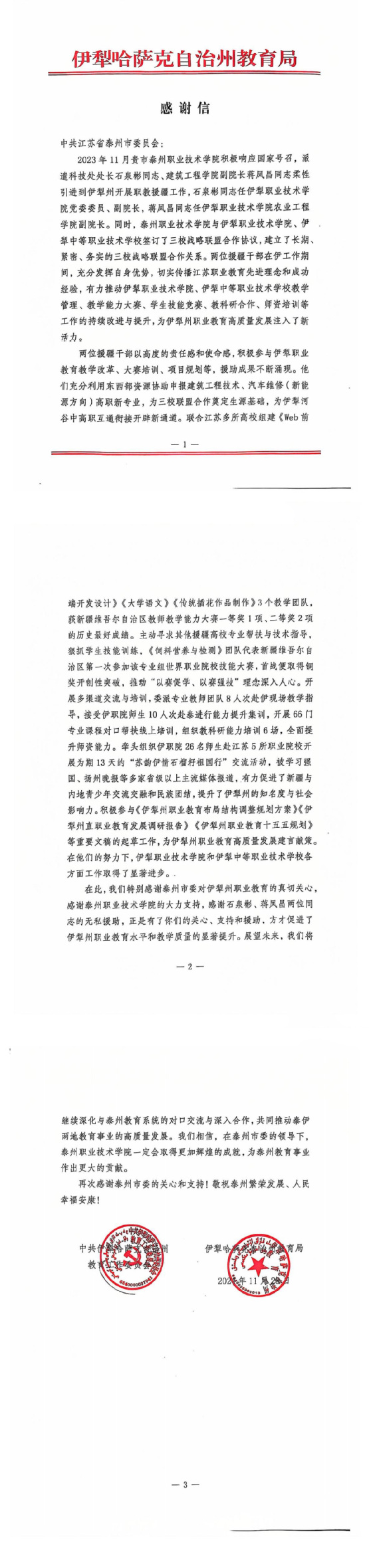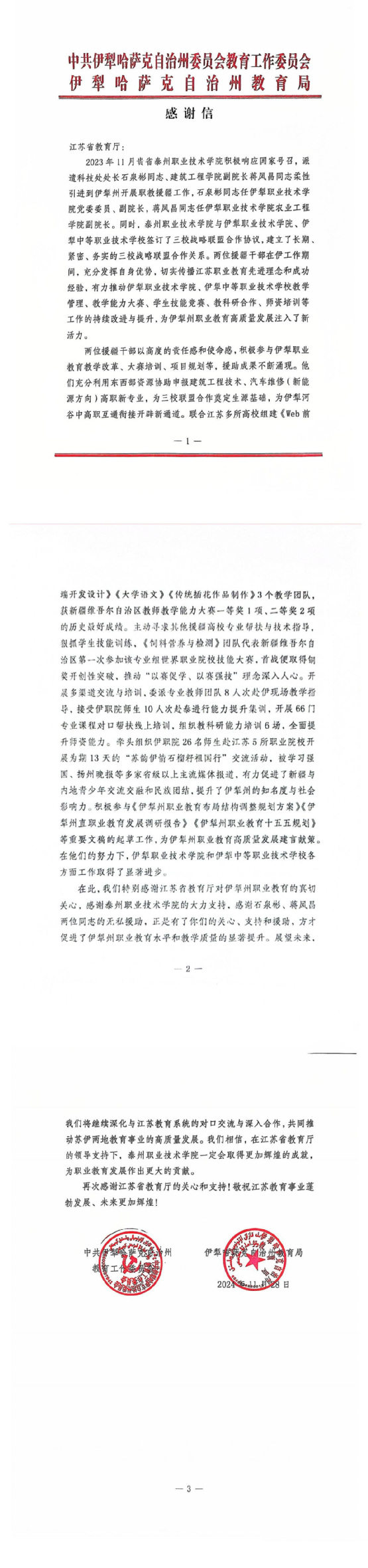 近日,中共伊犁哈萨克自治州教育工作委员会、伊犁哈萨克自治州教育局联合向江苏省教育厅和泰州市委发来感谢信,对泰州职业技术学院对口援助伊犁职业技术学院和伊犁中等职业技术学校表示感谢。