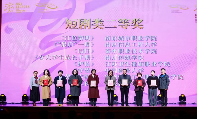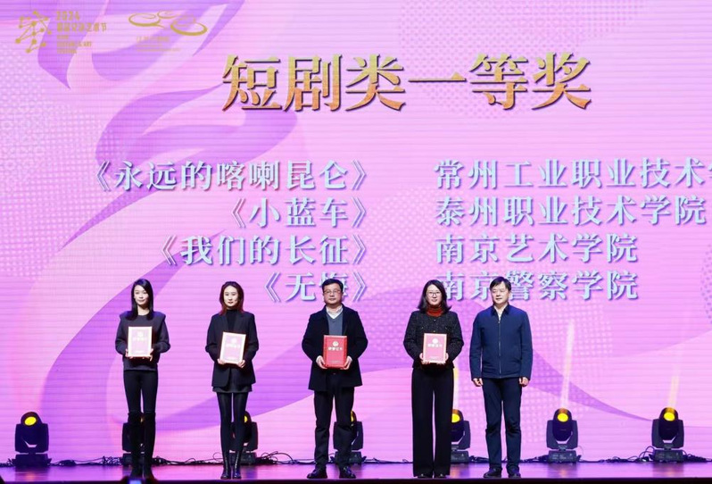 近日,由中共江苏省委宣传部、江苏省教育厅主办的2024江苏省大学生戏剧展演活动在江苏大剧院圆满落下帷幕。本次展演活动,共有全省本科及专科62所高校提交96部作品参赛。我校大学生艺术团选送的两部短剧《小蓝车》、《信任》在激烈的竞争中脱颖而出,分别获得短剧类一等奖和二等奖,创我校参赛史上最佳成绩。 其中短剧《小蓝车》作为获奖优秀剧目,受邀参加颁奖典礼演出。