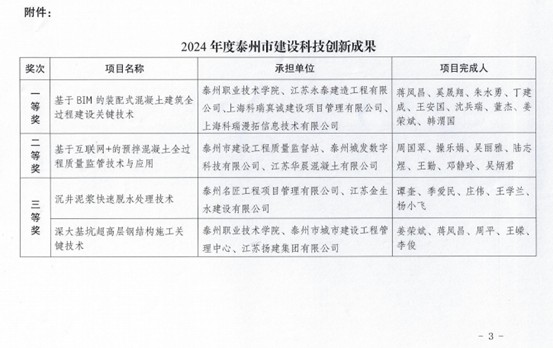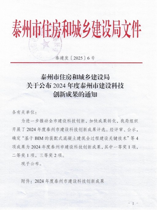 1月20日,泰州市住房和城乡建设局公布了《关于2024年度泰州市建设科技创新成果的通知》,我校建筑工程学院与江苏永泰建造工程有限公司(特级施工企业)、上海科瑞真诚建设项目管理有限公司(双甲级咨询企业)等单位合作的项目“基于BIM的装配式混凝土建筑全过程建设关键技术”荣获一等奖。同时,建筑工程学院与泰州市城市建设工程管理中心、江苏扬建集团有限公司(特级施工企业)等单位合作的项目“深大基坑超高层钢结构施工关键技术”荣获三等奖。