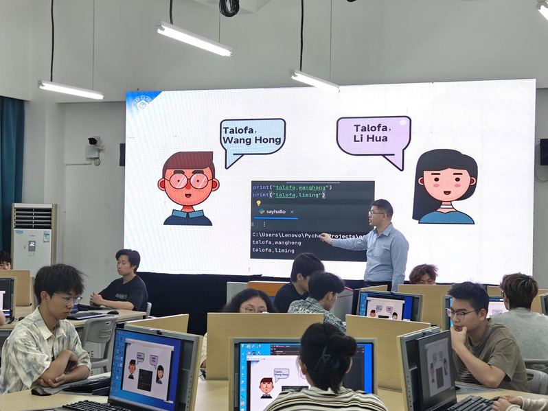 课程聚焦编程核心基础概念——“变量”。马天宇老师全程运用流利英文,用清晰的逻辑解析和代码演示向同学们讲授知识点;季老师则通过生动的案例演示,将抽象理论转化为易于理解的生活常识来讲述,并且辅助马老师为同学们答疑解惑。课堂上师生积极进行全英文互动问答与实操练习,充分展现了学院国际化教学模式的有效探索,也为即将在萨摩亚开展的教学活动积累了宝贵的跨文化实践经验。
