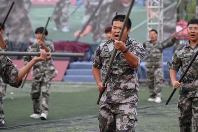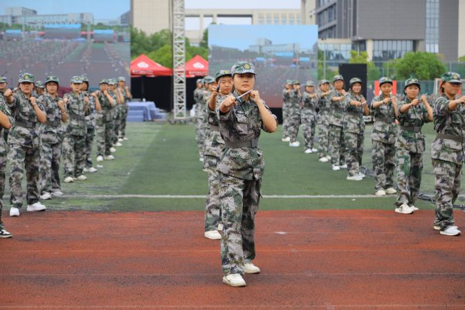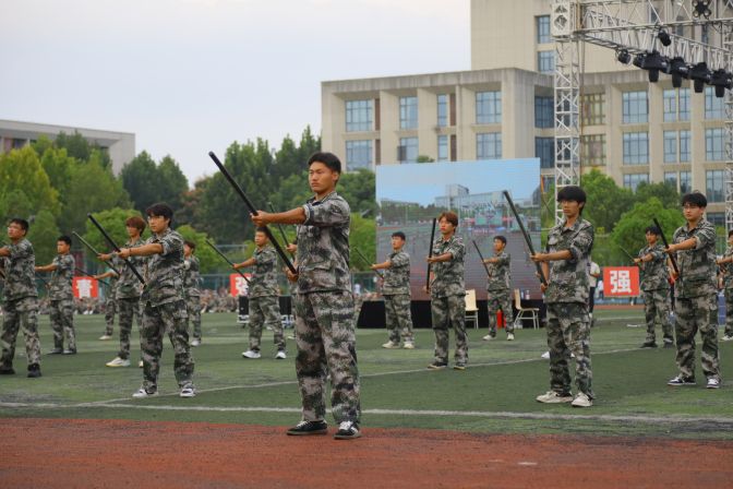 在激昂庄严的国歌声中,军训成果汇报正式拉开帷幕。参训学生精神抖擞、意气风发,军姿挺拔严整,步伐坚定铿锵。各特色方阵分别展示了图案板、分列式、军体拳、匕首操、应急棍、战术模拟等军训集中训练阶段的优良成果。
