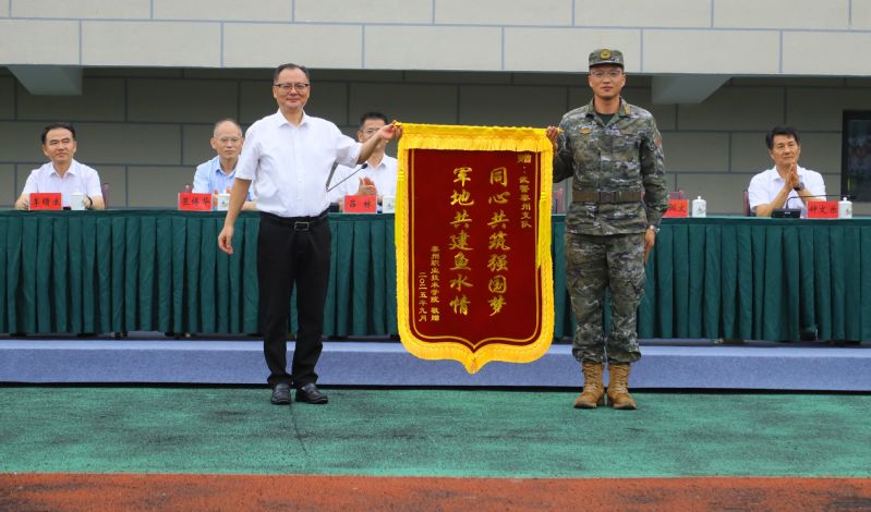 9月29日下午,我校2025级新生军训总结表彰大会在田径场隆重举行。参训新生以昂扬的精神状态、崭新的精神风貌展示汇报了军训成果。校党委书记张涛代表学校向武警泰州支队赠送锦旗,校党委副书记、校长吕林主持大会,武警泰州支队参谋长孔弼文及全体校领导出席大会。