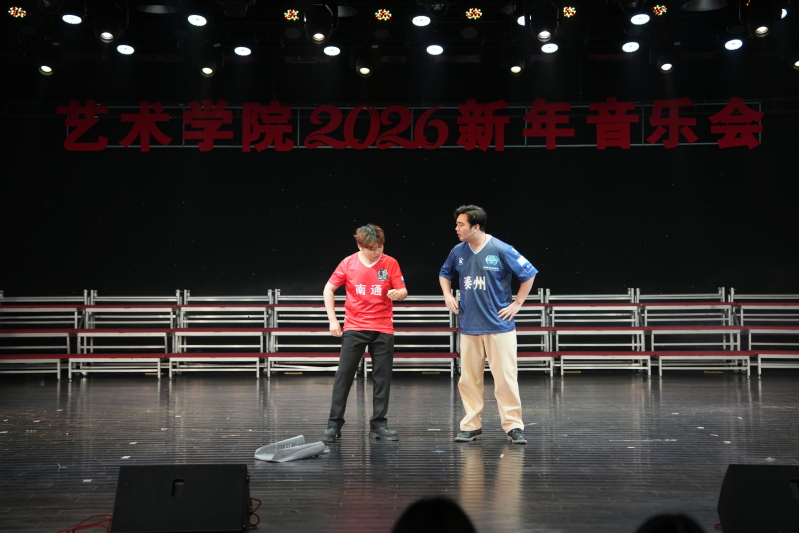 音乐会兼顾经典与青春表达,既有经典作品的深情演绎,也有《想去海边》等现代乐曲的活力呈现。相声《我爱苏超》巧妙融入地方文化元素,以轻松幽默方式展现了学子扎根生活的创作视角。音乐会在全体合唱《我相信于是我坚持》中推向高潮,激昂旋律凝聚起师生们的奋进力量。牛星老师指挥合唱后分享了从教心得,真挚话语中满含对教育事业的热爱与坚守。六位师生主持人围绕“敬自己、敬团队、敬时代”深情回顾了过去一年的耕耘,表达了新一年以艺赋能、服务社会的坚定决心。